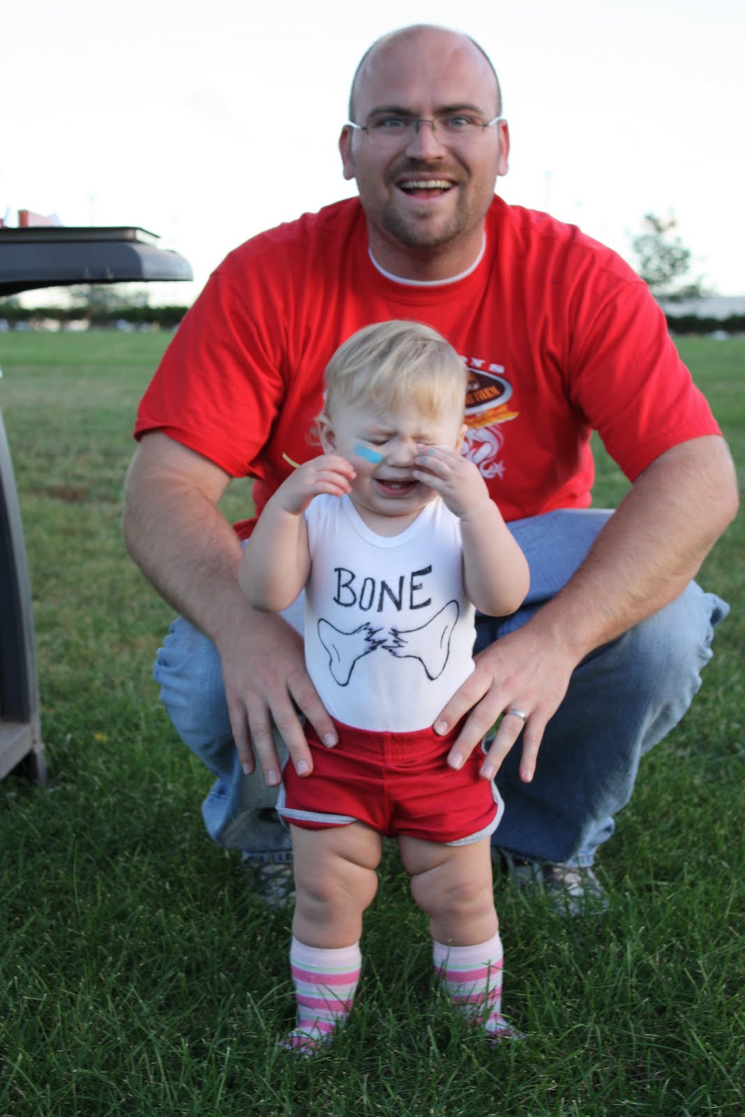 This past Sunday we had a flag football game to "Kick-off" football season (fall). Abi, Charli Kaye, & I decided we were going to "GO ALL OUT" so we made shirts & dressed the part! We decided to call ourselves the BONE CRUSHERS!!! We had a GREAT time and everyone was deathly afraid of us!!!